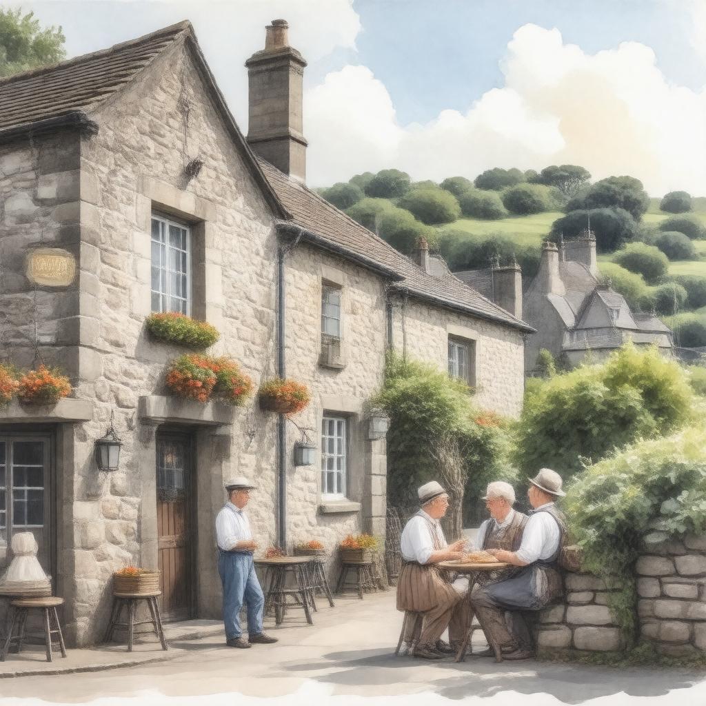 "Generate an image of a traditional Guernsey scene, featuring a old stone building, possibly a church or a pub, with a sign written in Guernésiais (also known as Guernsey French) and a few locals speaking to each other in the foreground, set against a backdrop of the Channel Islands' lush greenery, in a watercolor style that evokes a sense of nostalgia and cultural heritage."