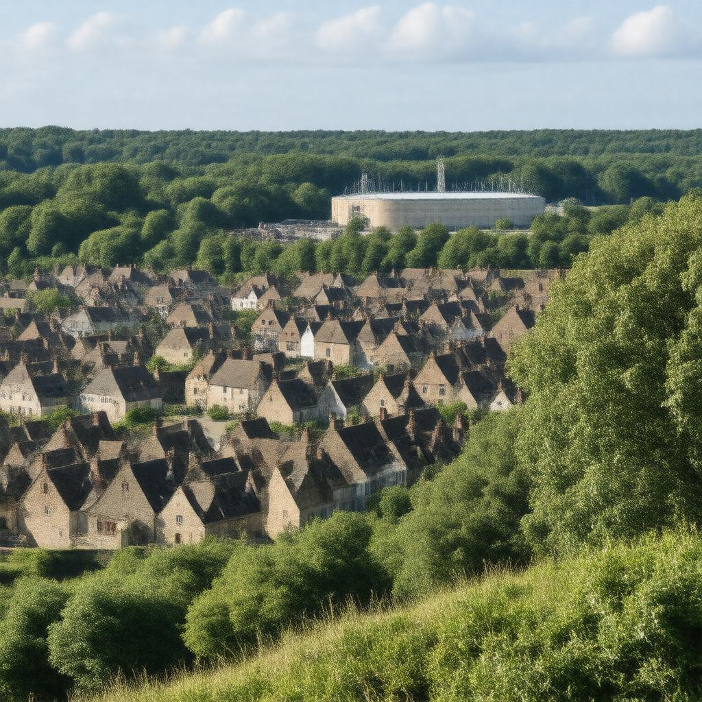 "Generate a realistic image of the town of Guingamp, located in the Brittany region of France, with its medieval architecture, situated near the River Trieux, and featuring the iconic Stade municipal de Roudourou stadium in the background, under a sunny day with a few clouds."