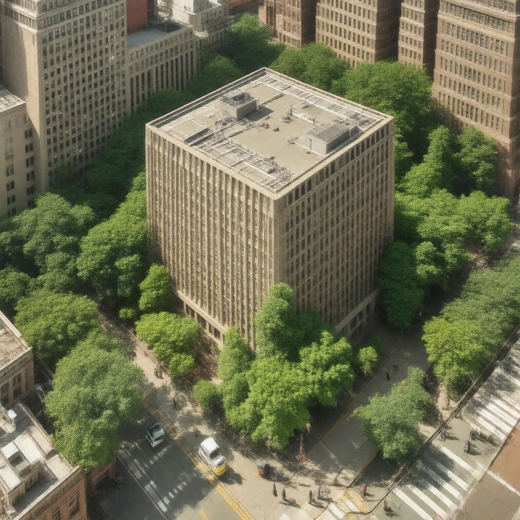 "aerial view of Guttman Community College campus at 50 West 40th Street, New York, NY 10018, with modern buildings and lush greenery, surrounded by the bustling streets of Manhattan, with a few students walking around, in a realistic and architectural style"