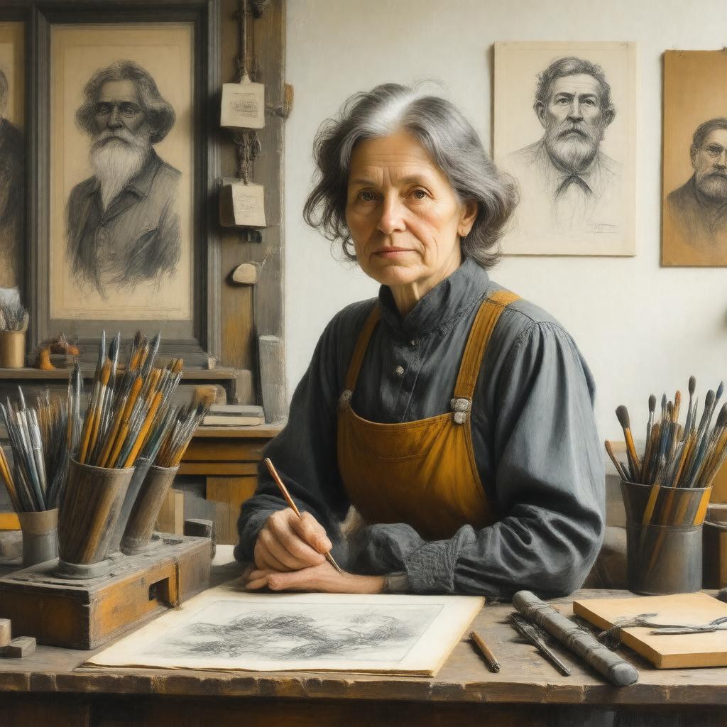 Create an image of Gwen Raverat, a British artist and engraver, in her studio, surrounded by her wood engravings and tools, wearing a thoughtful expression, with a subtle background that hints at her connection to the Bloomsbury Group and her family ties to Charles Darwin, in a style that blends realism with a touch of early 20th-century elegance.