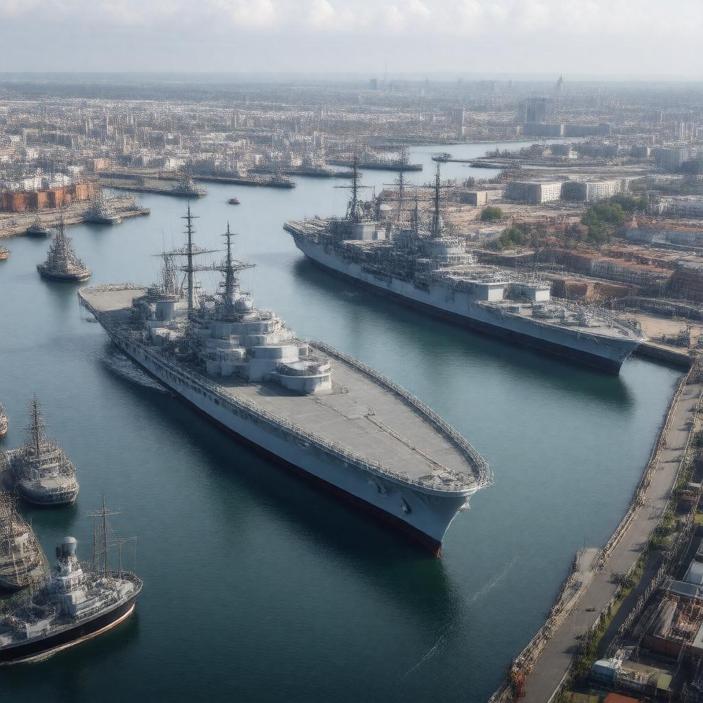 "Generate a realistic image of a large naval base located in Portsmouth, United Kingdom, with various naval ships and facilities, including the Queen Elizabeth-class aircraft carriers, Type 45 destroyers, and historic vessels such as HMS Victory and HMS Warrior, surrounded by naval buildings, docks, and training facilities, in a daytime setting with a coastal background."