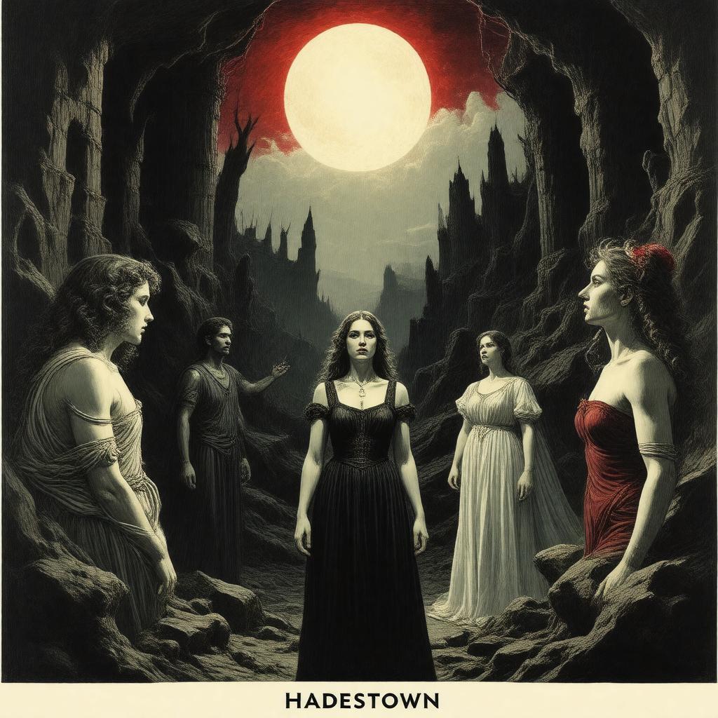 "Generate an image of a dark, mystical underworld scene with a mix of industrial and ancient Greek elements, featuring a group of people, including Orpheus, Eurydice, Hades, and Persephone, surrounded by a haunting, atmospheric landscape, representing the musical 'Hadestown', with a style that blends folk, rock, and opera influences."