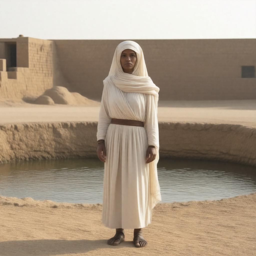 Generate an image of Hagar, a biblical figure and Egyptian slave, standing alone in the Desert of Beersheba, with the Zamzam Well in the background, dressed in traditional Middle Eastern attire, conveying a sense of resilience and faith, in a realistic and serene style.