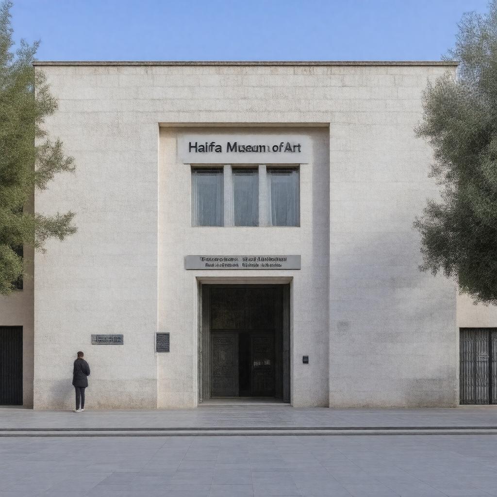 "Generate an image of the Haifa Museum of Art, a modern and contemporary art museum located in a historic building at 26 Shabbetai Levi Street, Haifa, Israel, with a prominent entrance and a sign in Hebrew, English, and Arabic, surrounded by artworks or installations that reflect its focus on contemporary and modern art, with a bustling atmosphere and a glimpse of the Haifa Center HaShmona railway station nearby."