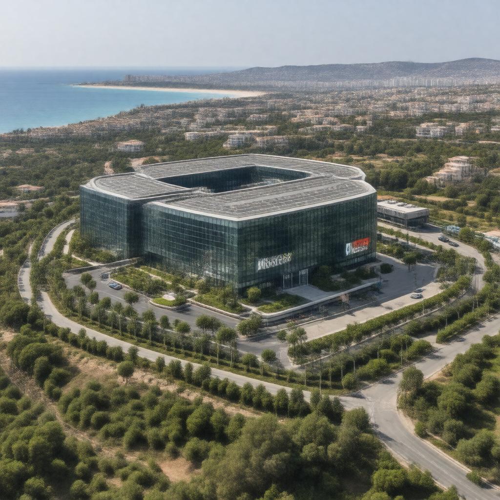 "Generate a realistic image of a large, modern business park, situated on a hillside overlooking the Mediterranean coast, with sleek glass and steel buildings, surrounded by lush greenery, and featuring several prominent company logos, including Intel, Microsoft, and Google, with Carmel Beach and Haifa South Railway Station visible in the distance, representing Haifa Science Park, also known as Matam, in Haifa, Israel."
