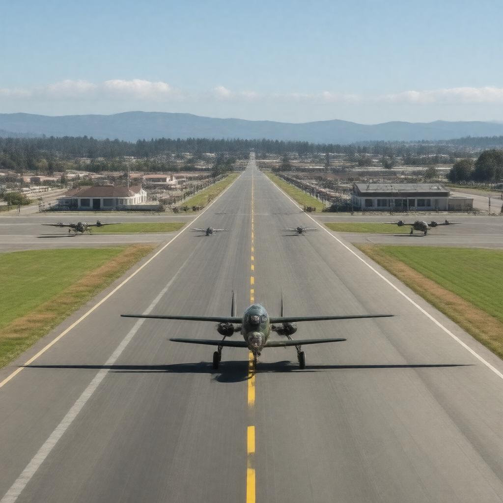 "Generate a realistic image of a historic military airfield, specifically Hamilton Field in Marin County, California, during its operational peak in the 1940s, with vintage aircraft on the runway and characteristic Art Deco-style buildings in the background, reflecting its significance as a former United States Army Air Corps, United States Army Air Forces, and United States Air Force base, and a notable part of Air Defense Command and Fourth Air Force."