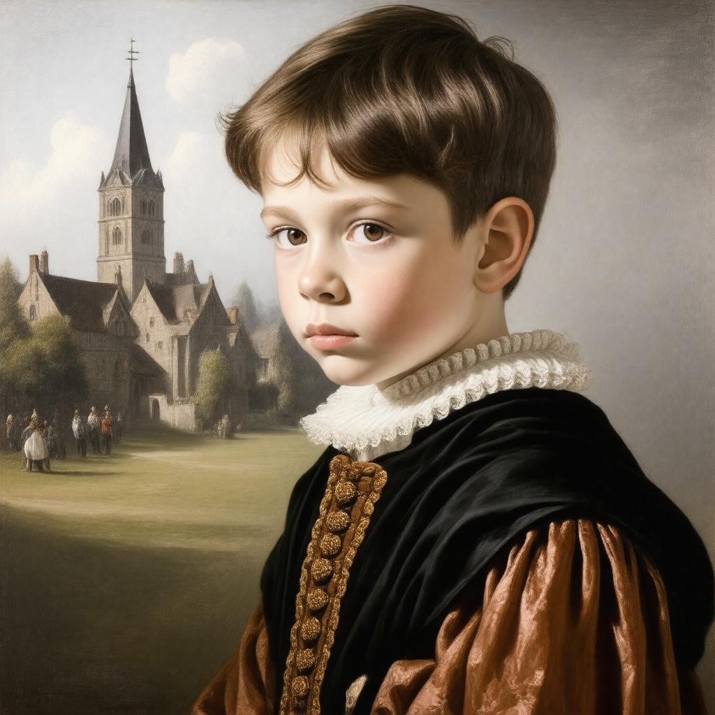 Generate a realistic portrait of a young boy in 16th-century English attire, specifically a boy from a modestly prosperous family in Stratford-upon-Avon, with a contemplative expression, set against a backdrop that subtly hints at his connection to the town and his family, such as a distant view of the Stratford-upon-Avon church or a Shakespeare family coat of arms, in the style of a Renaissance-era portrait.