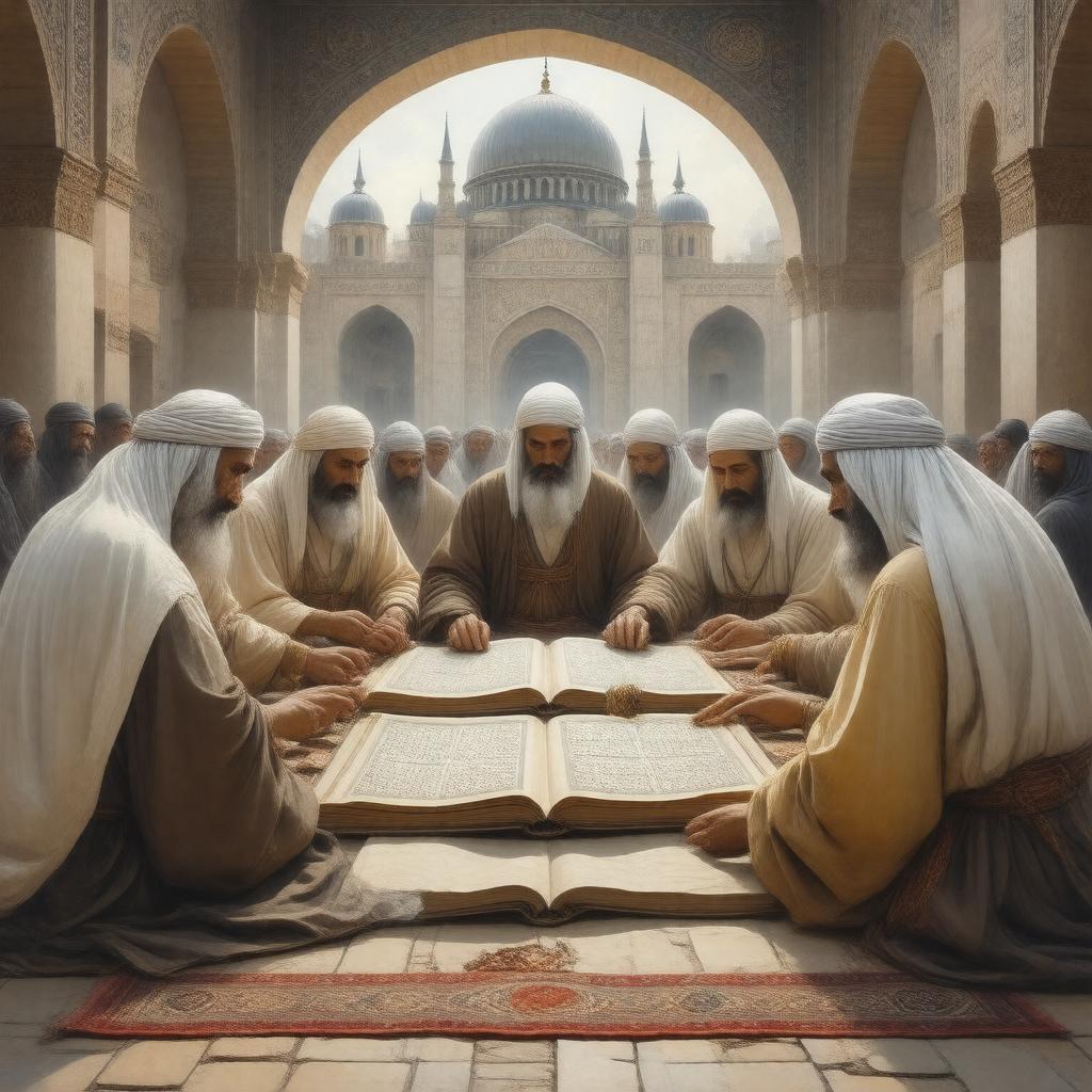 Create an image of a traditional Islamic architecture with a mosque or a madrasa in the background, and a group of scholars or students in traditional Islamic attire sitting around a table with books and scrolls of the Quran and Hadith, representing the Hanbali school of thought, with a focus on simplicity and adherence to the original texts, in a style that reflects the cultural and historical context of the 9th century Middle East, with Arabic calligraphy and intricate geometric patterns, and a color palette that evokes a sense of warmth, tradition, and spirituality.