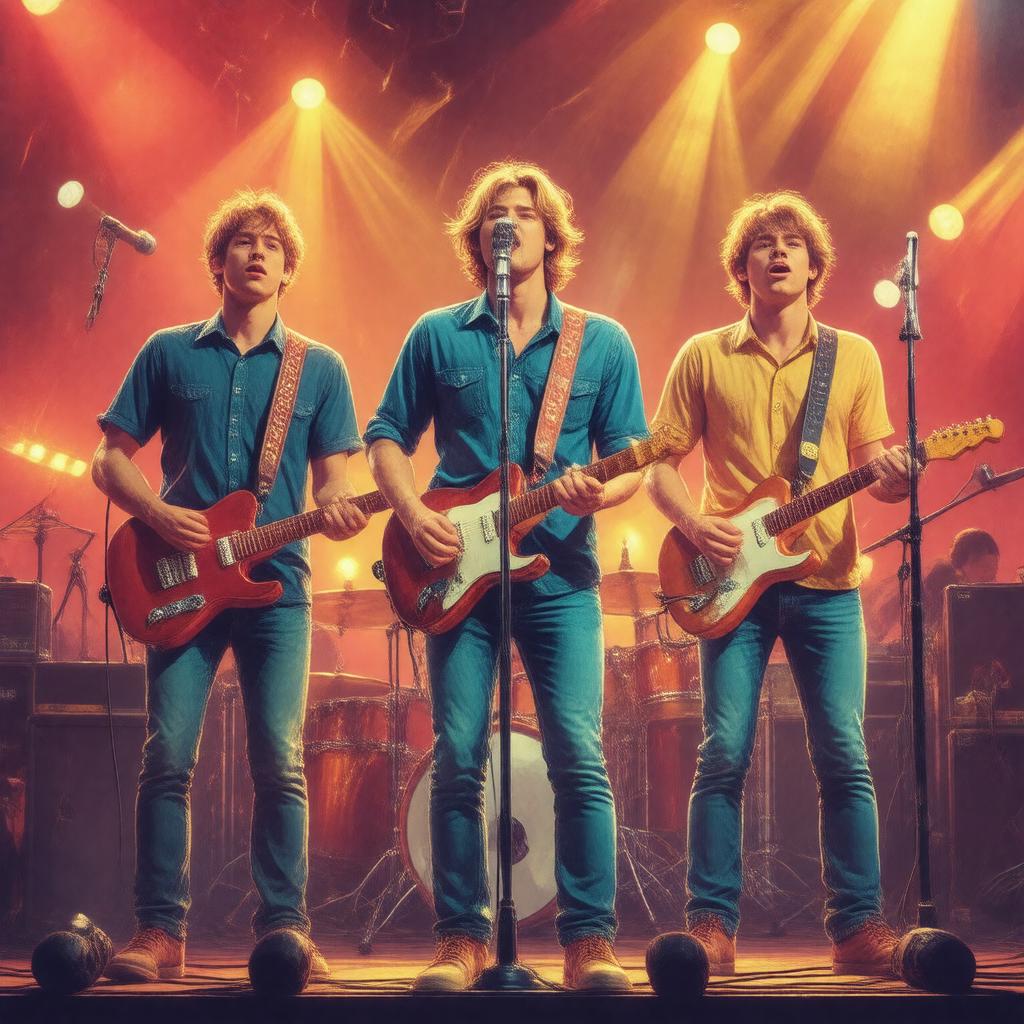 "Generate an image of the American pop rock band Hanson, consisting of three brothers, Isaac, Taylor, and Zac Hanson, performing on stage with their instruments, with a background that reflects their origin in Tulsa, Oklahoma, and incorporates elements of their notable works, such as the album Middle of Nowhere and the hit song MMMBop, in a vibrant and energetic style that captures the spirit of their music."
