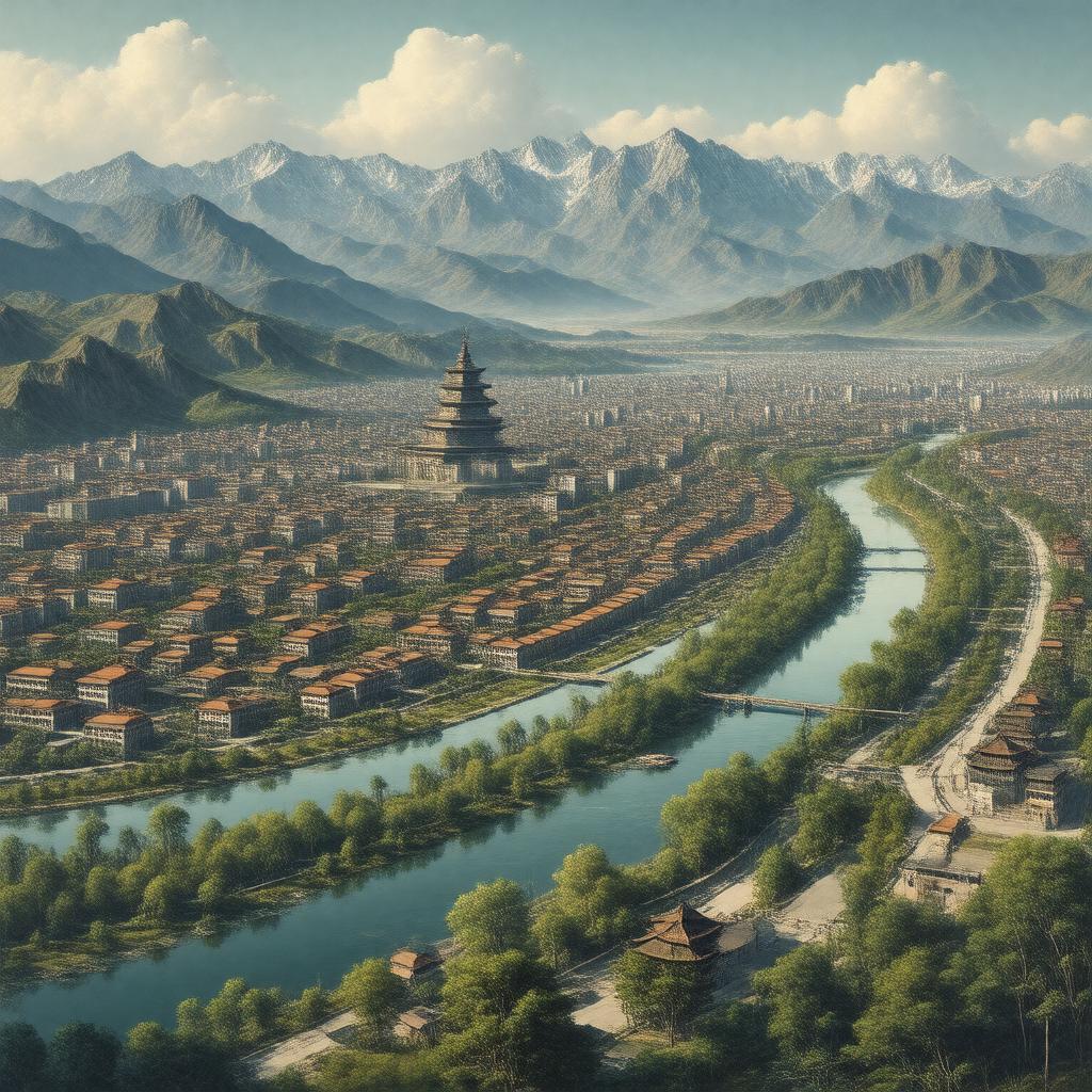 "Generate a realistic image of Hanzhong city in southwestern Shaanxi, China, showcasing its scenic landscape, possibly with the Han River flowing through, surrounded by mountains like Mount Dingjun, and a subtle hint of historical significance, possibly with a traditional architecture or a monument in the background, under a sunny day with a humid subtropical climate."