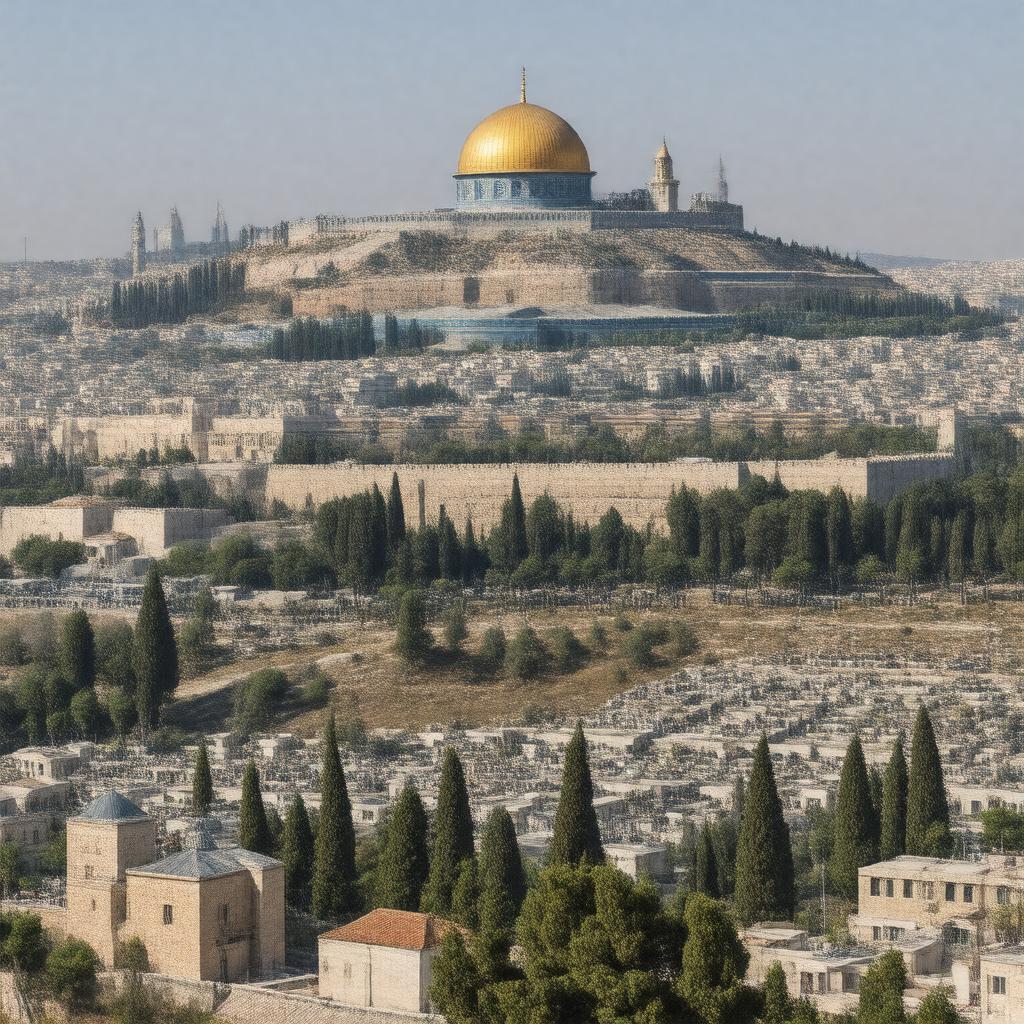 "Generate an image of Har HaZeitim, also known as the Mount of Olives, a mountain and cemetery overlooking the Old City of Jerusalem, with a panoramic view of the Temple Mount, Dome of the Rock, and Al-Aqsa Mosque in the background, and various tombs and churches such as the Church of All Nations and the Tomb of the Prophets in the foreground, in a realistic and serene style."