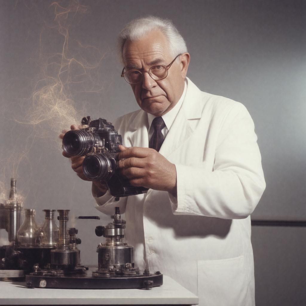 Create a realistic image of Harold Edgerton, an American engineer, professor, inventor, and photographer, in a setting that reflects his work in stroboscopic photography, high-speed photography, or electrical engineering, possibly holding a camera or standing in front of a laboratory equipment, dressed in attire typical of the mid-20th century, with a serious and focused expression, in a style that blends realism with a hint of nostalgia.