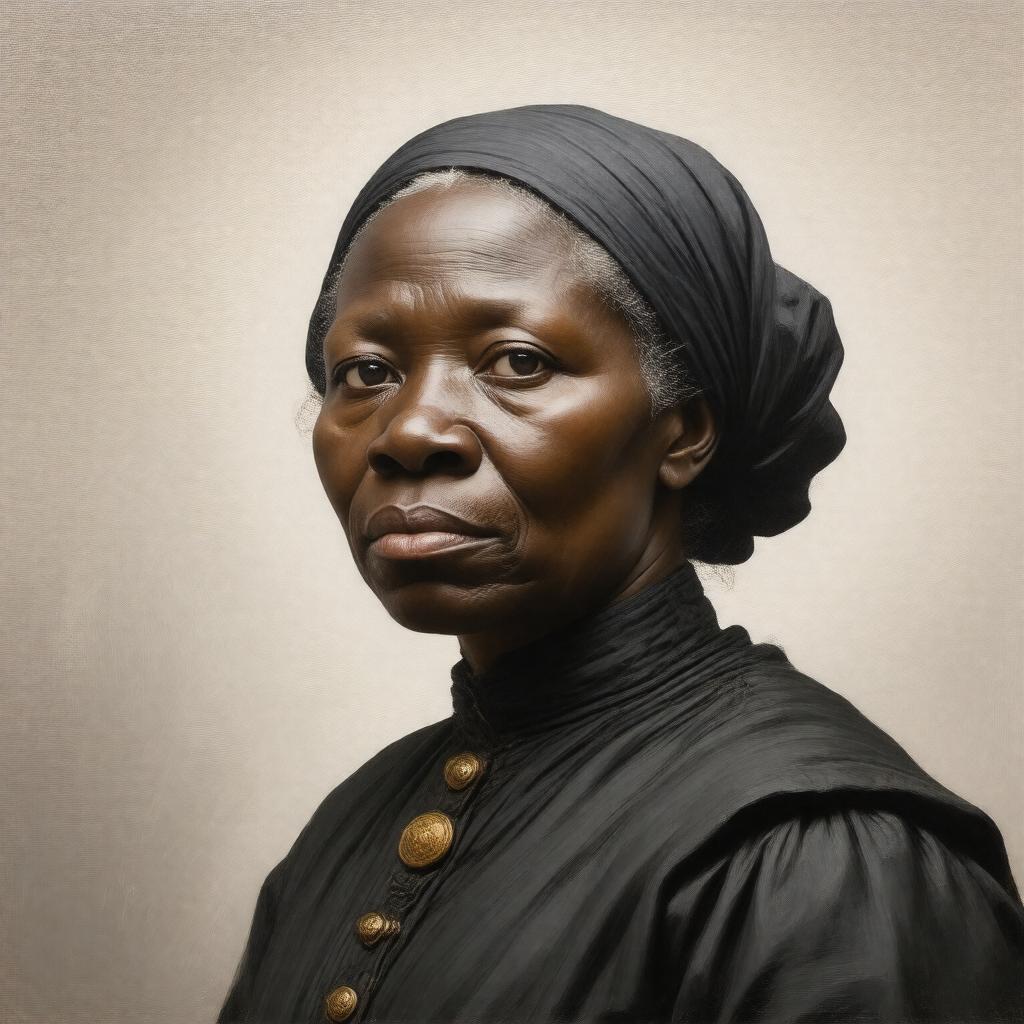 Create a realistic portrait image of Harriet Tubman, an American abolitionist, activist, nurse, spy, and suffragist, in a dignified and powerful pose, reflecting her courageous legacy as a conductor on the Underground Railroad and her tireless fight for freedom and equality, in a style reminiscent of 19th-century American portraiture, with a muted color palette and a strong sense of determination in her facial expression.