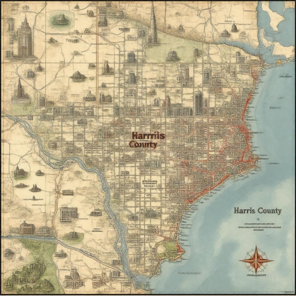 Generate an image of a map highlighting Harris County, Texas, with the county seat, Houston, prominently marked, surrounded by notable landmarks and features, in a realistic style.