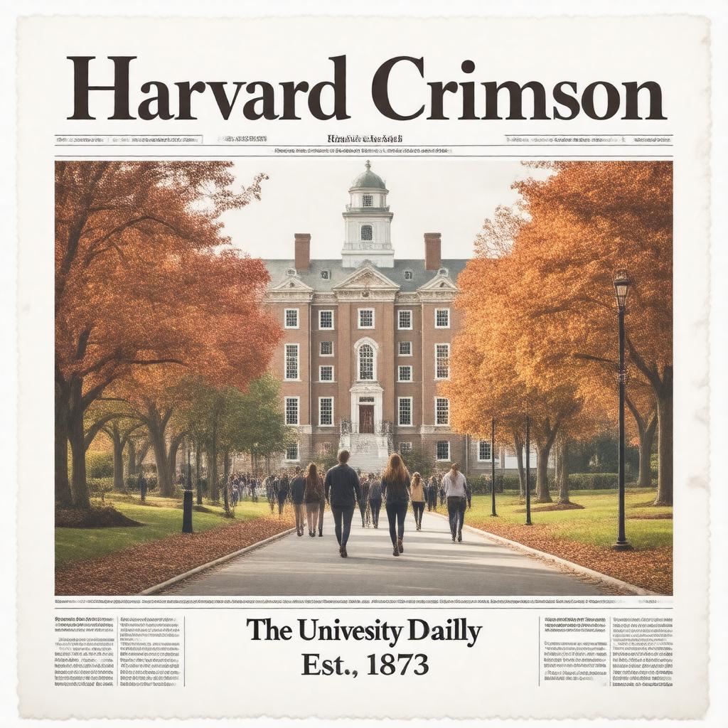 "Generate an image of the Harvard Crimson newspaper logo on a broadsheet front page, with a classic Harvard University campus background, depicting a quintessential New England autumn scene with students walking in the distance, in a realistic and traditional style, with the logo prominently displayed and the motto 'The University Daily, Est. 1873' included."
