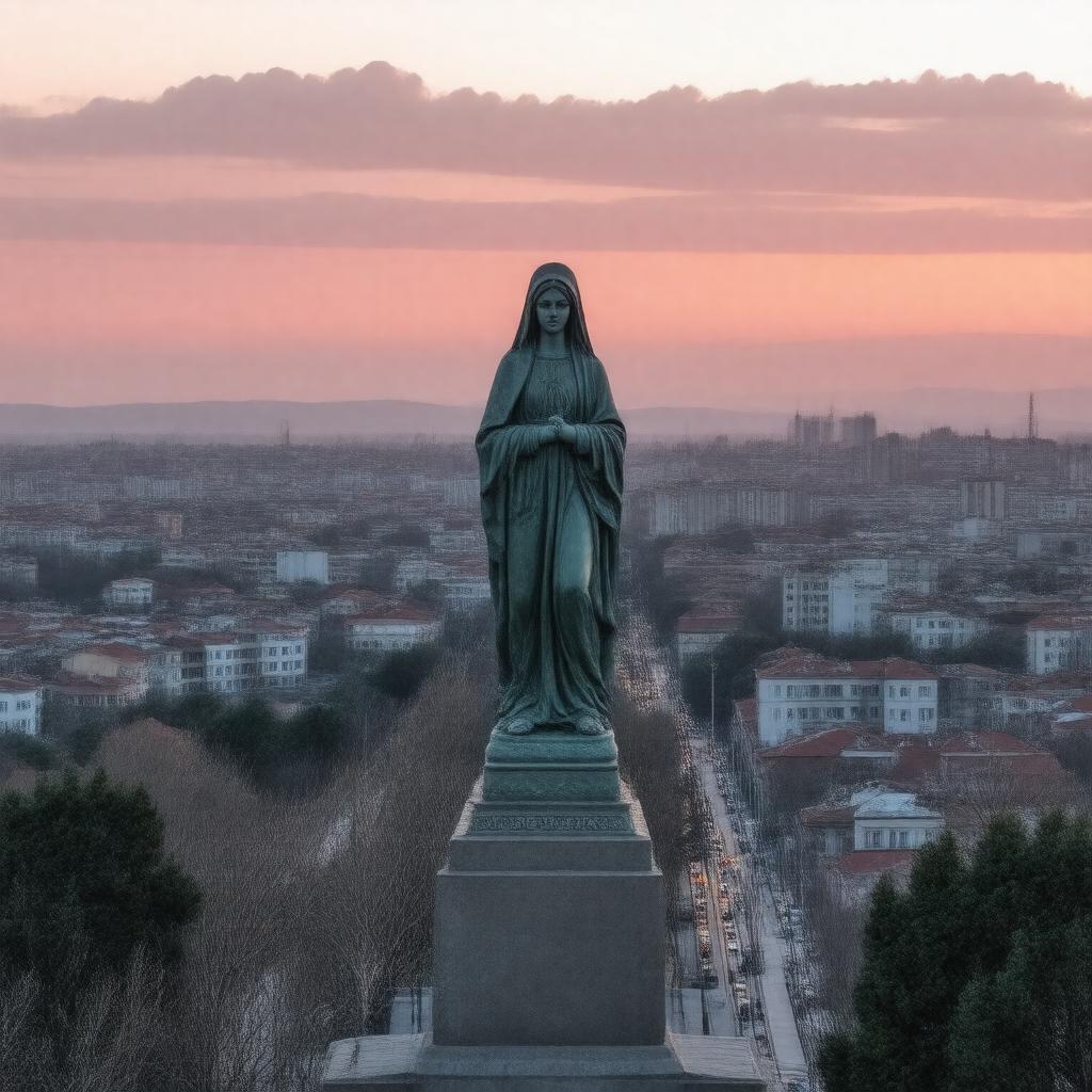 "Generate an image of a cityscape at sunset, featuring the Statue of the Virgin Mary in the foreground, with a backdrop of buildings and streets in Haskovo, Bulgaria, incorporating a mix of modern and historic architecture, with a warm and vibrant color palette, reflecting the city's rich history and culture."