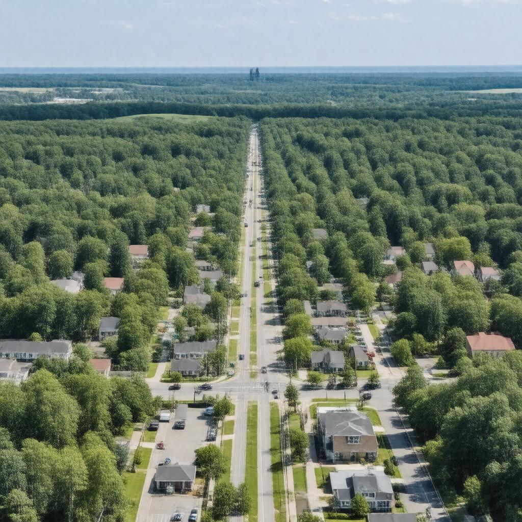 "Generate a realistic image of a suburban landscape representing Hauppauge, a census-designated place in Suffolk County, New York, with a mix of residential areas, commercial buildings, and possibly a glimpse of the Hauppauge Industrial Park, set against a backdrop of lush greenery and a clear sky, capturing the essence of a typical day in this Long Island community."