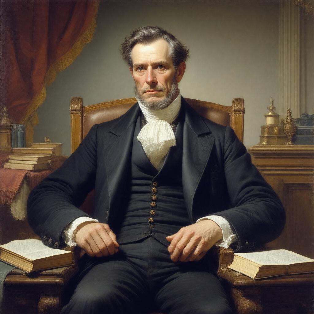 Generate a realistic portrait of Henry Peter Brougham, 1st Baron Brougham and Vaux, in a formal 19th-century attire, sitting in a chair with a thoughtful expression, surrounded by symbols of his profession, such as books and a law scroll, in a style reminiscent of Thomas Lawrence or George Hayter, who famously painted him.