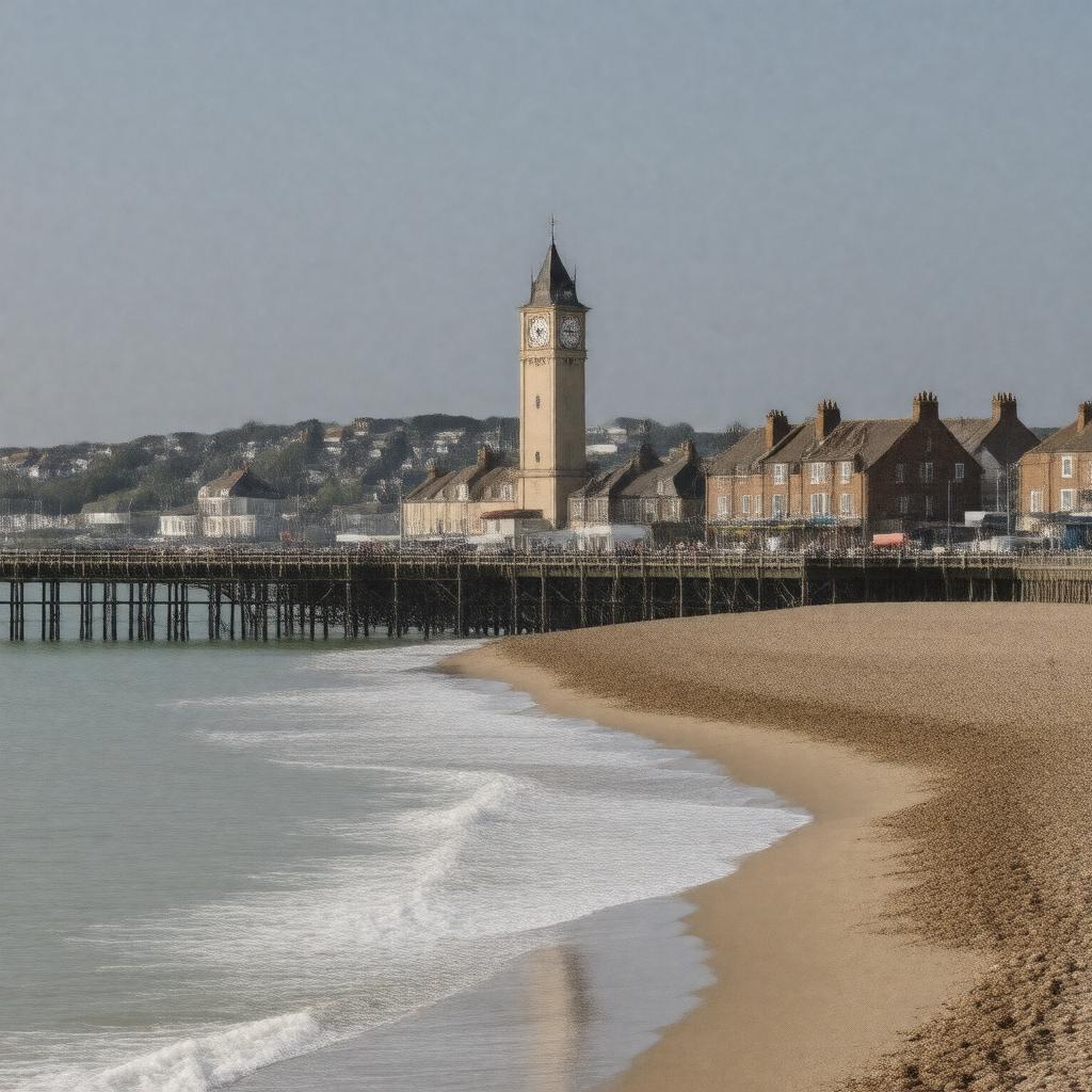 "Generate a realistic image of Herne Bay, a seaside town in Kent, England, showcasing its iconic pier, clock tower, and coastline along the North Sea, with a warm and sunny atmosphere, in a style reminiscent of a classic British seaside resort."
