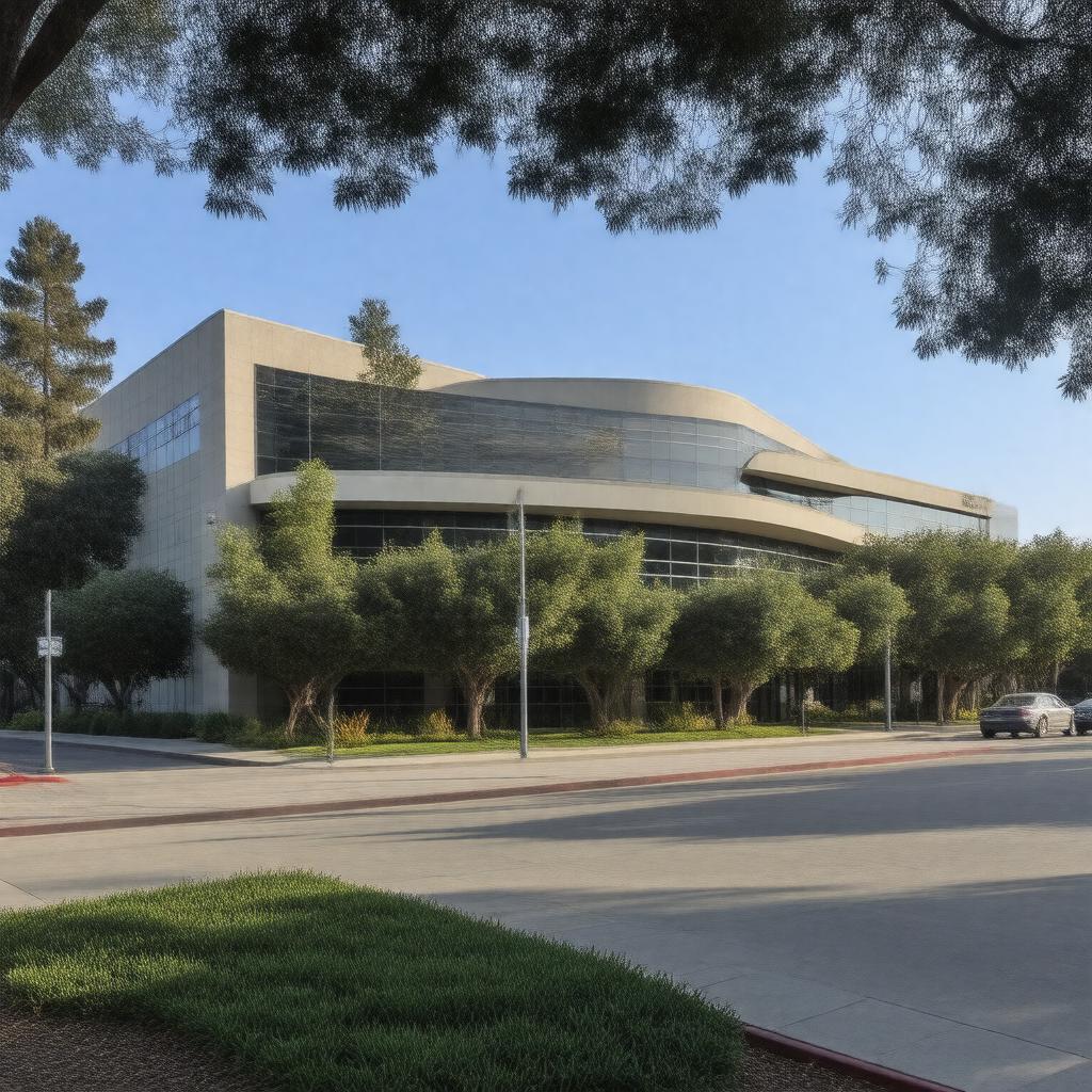 "Create an image of the Hewlett-Packard company headquarters in Palo Alto, California, United States, with a modern corporate campus in the background and a subtle hint of technology and innovation, representing the company's history and legacy in the information technology industry, founded by Bill Hewlett and Dave Packard in 1939, with notable products such as HP LaserJet and HP Pavilion visible in the scene."