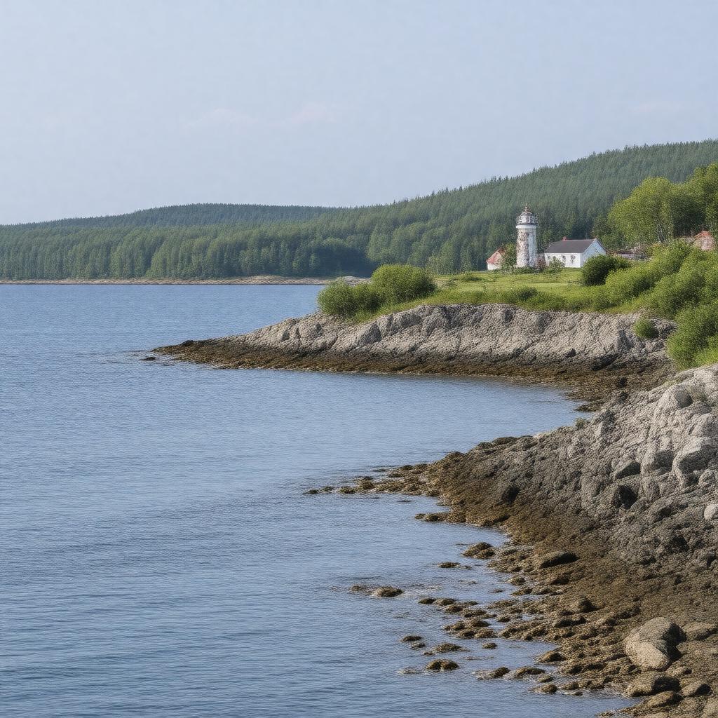 "Generate an image of a serene and natural island landscape, featuring a small town or village in the distance, with a prominent lighthouse standing tall on a rugged coastline, surrounded by the calm waters of the Baltic Sea, representing Hiiumaa, an island in Estonia, with a focus on its natural beauty and tranquil atmosphere, in a realistic style."