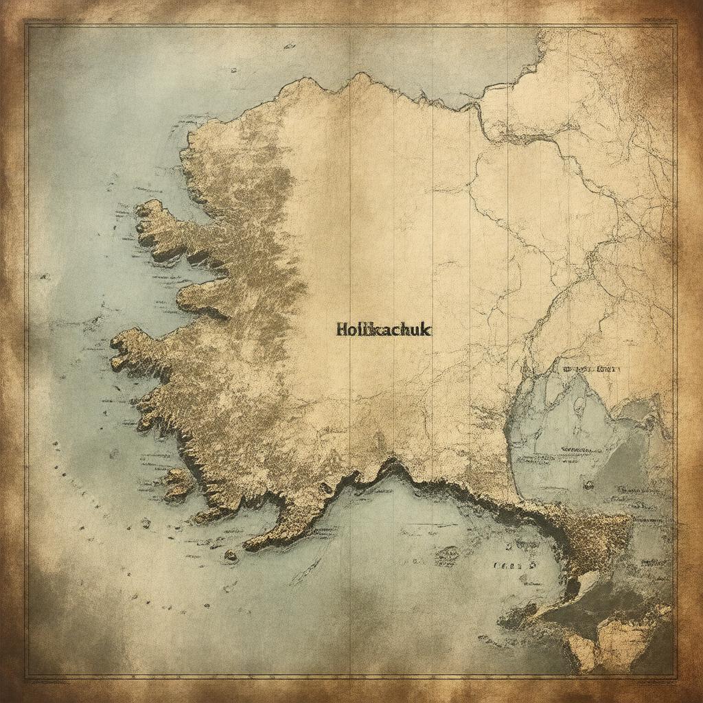 Generate an image of a vintage, worn-out linguistic map or a documentation page featuring the Holikachuk language, incorporating the Latin script, with a faded background of Alaskan landscape, symbolizing the extinction of the language, last spoken by the Holikachuk people in Alaska, with a subtle note or inscription mentioning "Innoko" as an alternative name, and a mention of Wilson Deacon, the last native speaker.