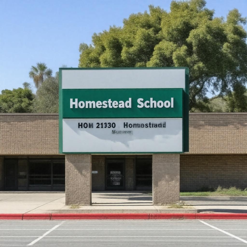 "Generate an image of the exterior of Homestead High School, a public high school located at 21370 Homestead Road, Cupertino, California, with a suburban campus and a sign displaying its name and mascot, the Mustang, in a realistic style, incorporating green and white colors."