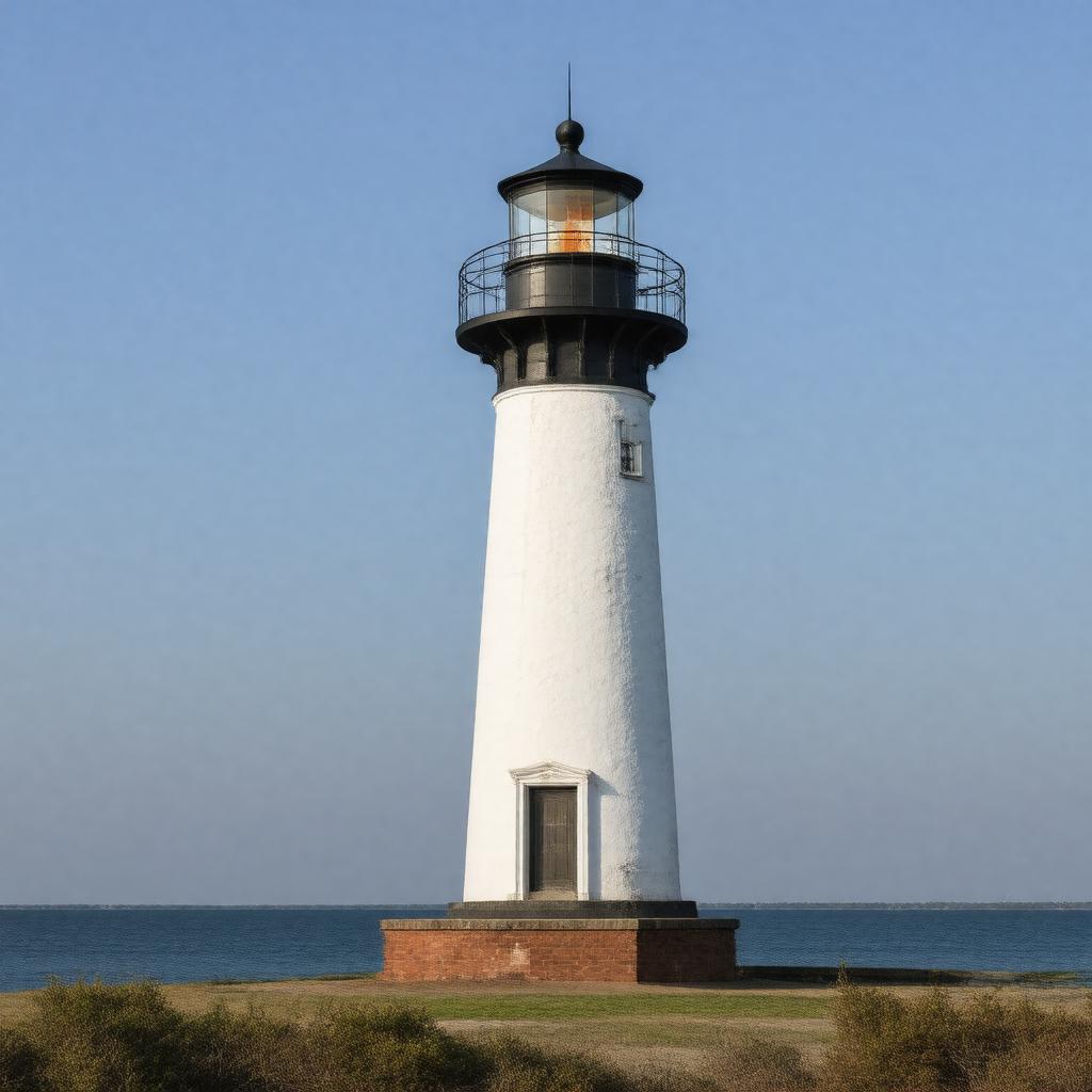 "Generate an image of a square-shaped, 45-foot tall, white and black marked lighthouse with a black lantern, situated on Hospital Point in Beverly, Massachusetts, with a granite base and brick structure, surrounded by sea and possibly with a coastal scenery, under a daytime sky, in a realistic style."