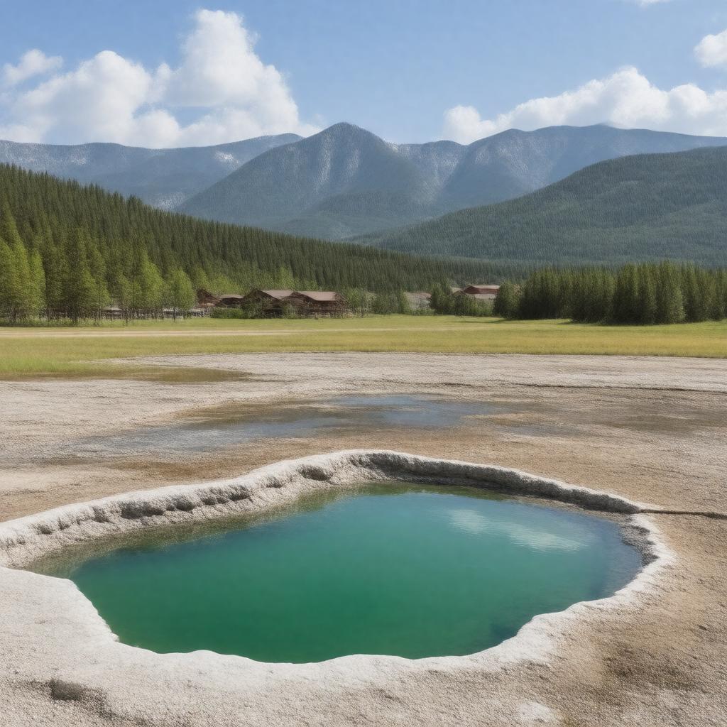 "Generate an image of a scenic view of Hot Springs County, Wyoming, showcasing its natural hot springs, surrounded by mountains and greenery, with a small town in the distance, possibly Thermopolis, in a realistic and serene style."