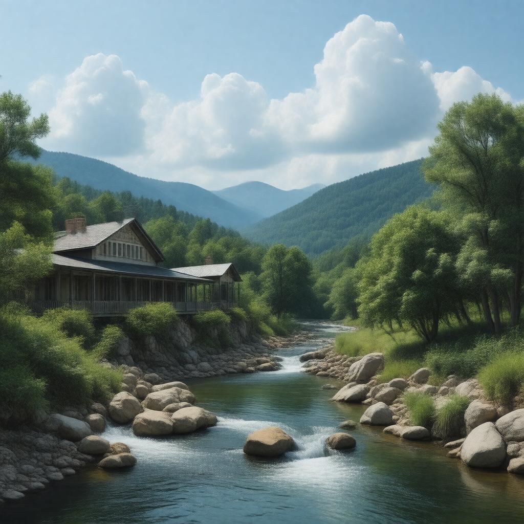 "Create an image of a serene and natural scene within Hot Springs National Park, showcasing the historic Bathhouse Row with the Fordyce Bathhouse in the foreground, surrounded by lush oak and hickory trees, with a gentle mountain stream running through the background, under a clear blue sky with a few puffy white clouds, in a realistic and detailed style."