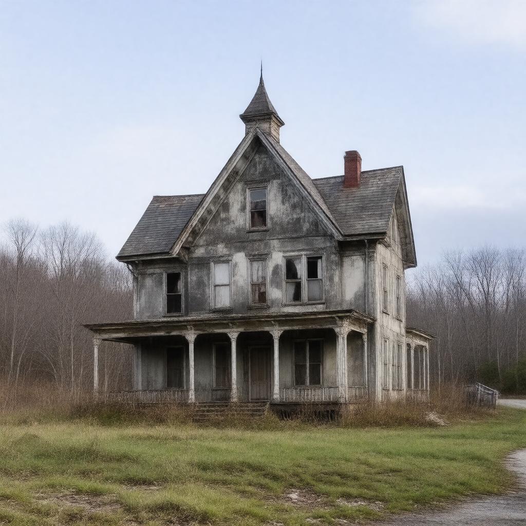 "Generate an image of an abandoned historic hotel with a mansard roof in the Second Empire architectural style, situated in a rural area, representing Hyde Manor in Sudbury, Vermont, United States."