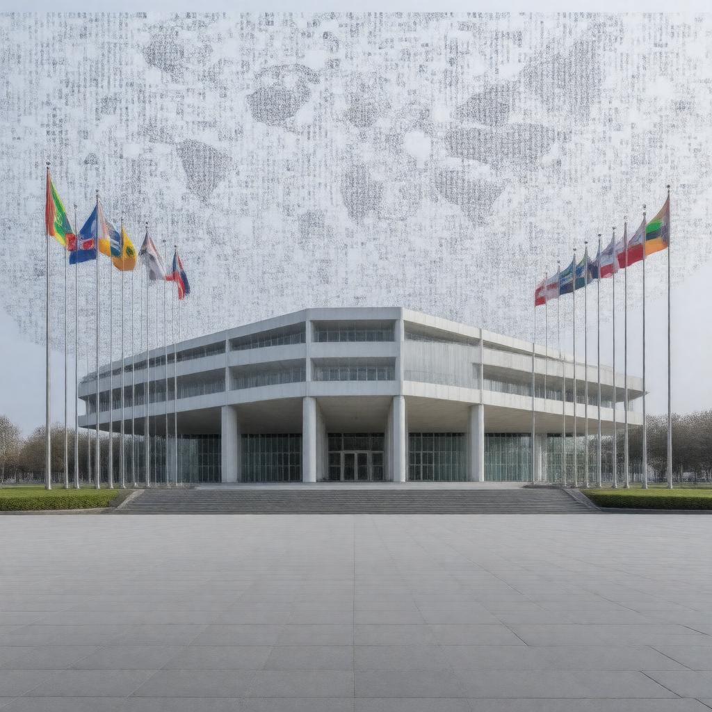 "Create an image of the International Telecommunication Union Telecommunication Standardization Sector (ITU-T) headquarters in Geneva, Switzerland, with a modern and sleek architectural style, surrounded by flags of different countries, representing the organization's role as a global standardization body for telecommunications, with a subtle background of coding and technical elements, symbolizing its main function of developing international telecommunications standards."