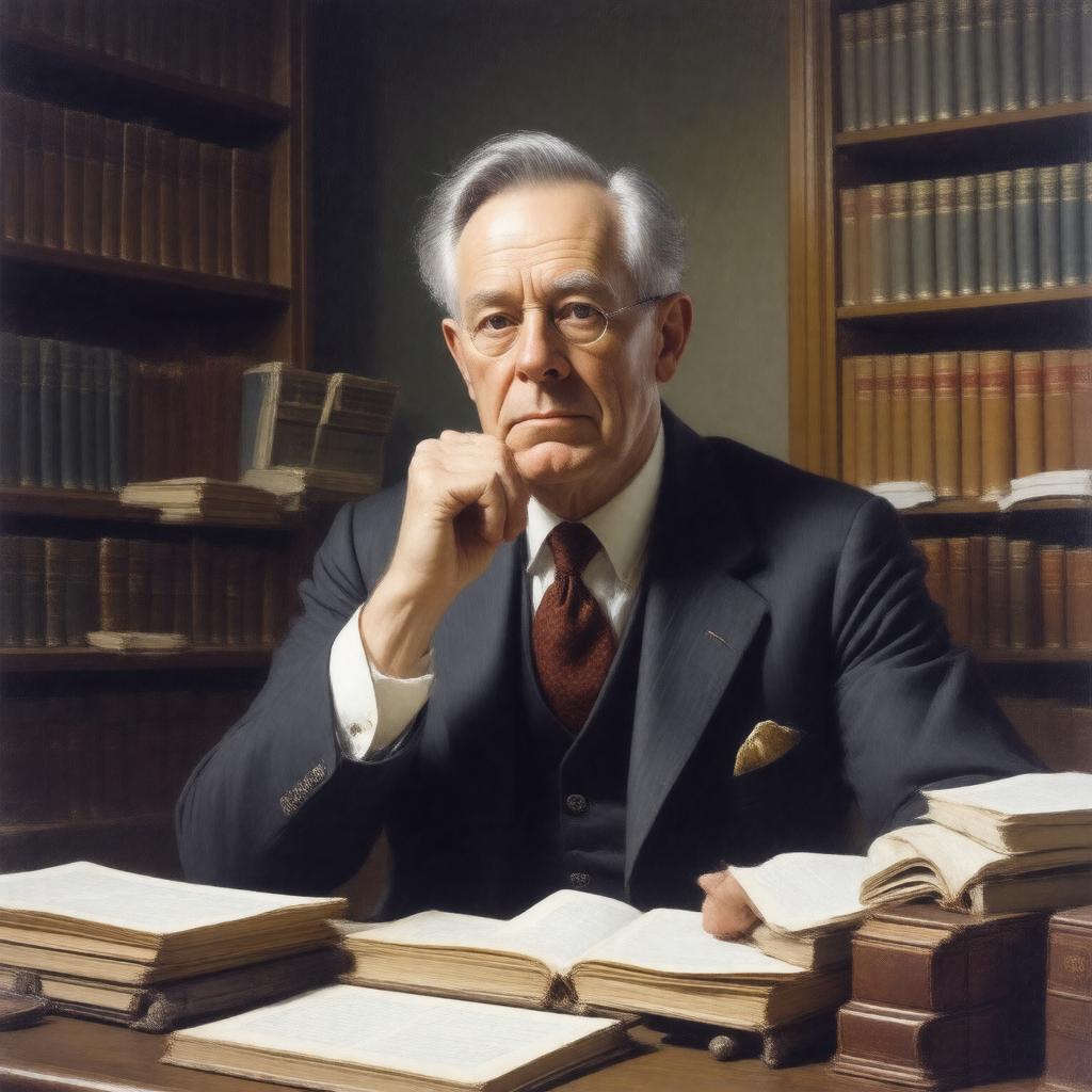 Generate a realistic portrait of Ian Little, a British economist, in a formal setting, possibly in a study or office, surrounded by books and papers, with a thoughtful expression, wearing attire typical of a British academic in the mid-20th century.