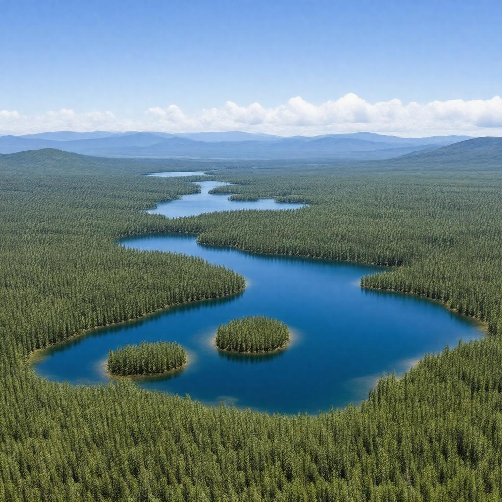 "Aerial view of a vast, serene lake surrounded by wilderness, with numerous islands scattered throughout, under a clear blue sky with a few wispy clouds: Iliamna Lake, located in Alaska, United States, showcasing its 2,622 square kilometers area, and maximum depth of 988 feet, with the Kvichak River flowing out and Newhalen River, Talarik Creek, and Pedro Bay flowing in, in a photorealistic style."