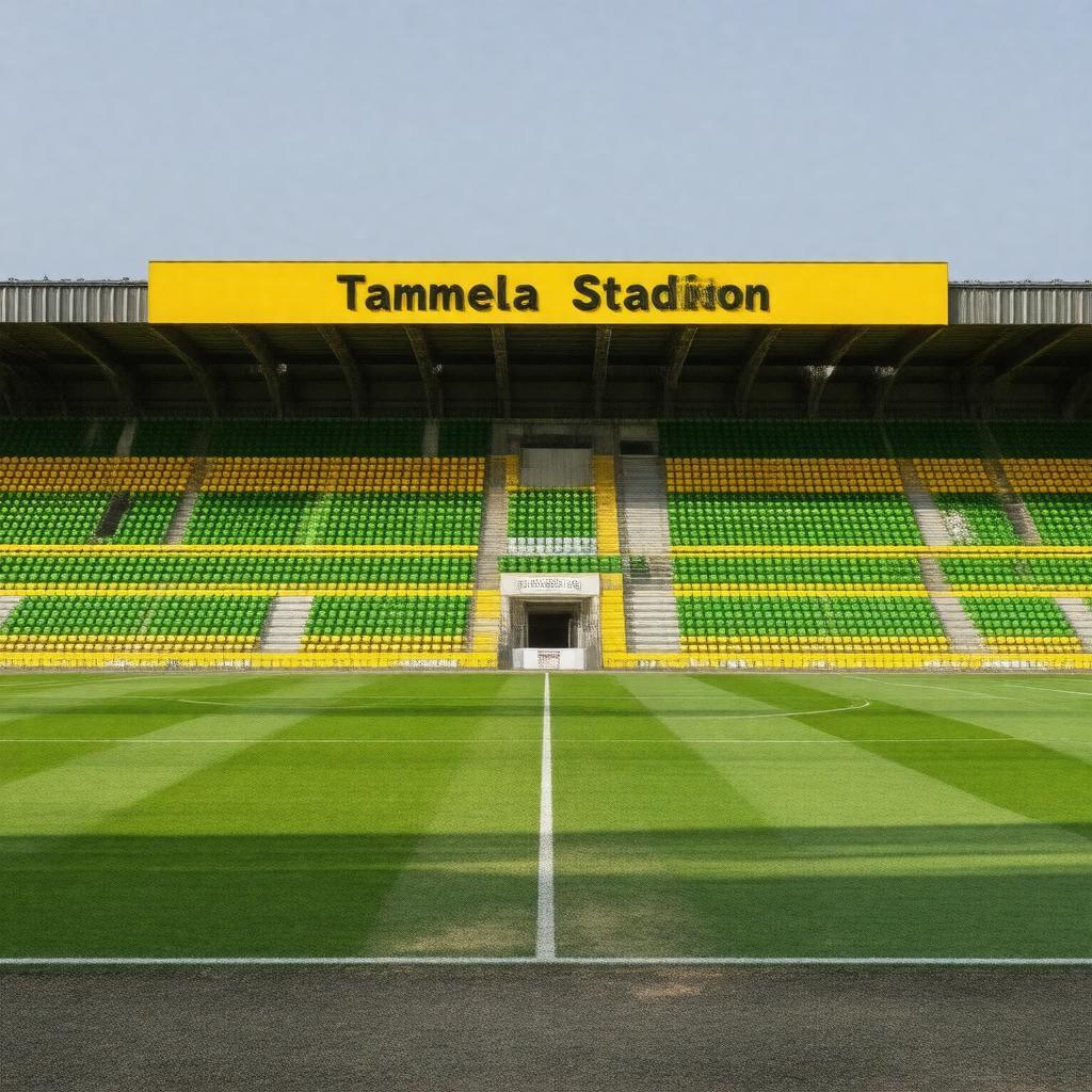 Generate an image of a football stadium with a prominent sign reading "Tammela Stadion" in a realistic style, with the colors yellow and green visible in the stadium's branding and surroundings, representing the football club Tampereen Ilves, also known as Ilves, based in Tampere, Finland.