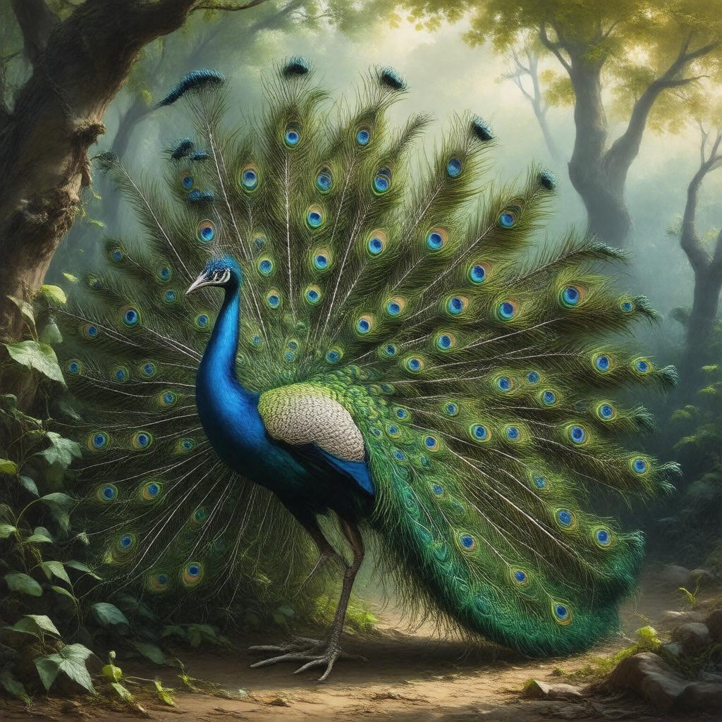 "Generate an image of a majestic Indian peacock (Pavo cristatus) in its natural habitat, showcasing its vibrant iridescent blue and green plumage, and long train of tail feathers, standing proudly with its feathers spread out, set against a lush green forest backdrop, in a realistic and detailed style, reminiscent of traditional Indian art."