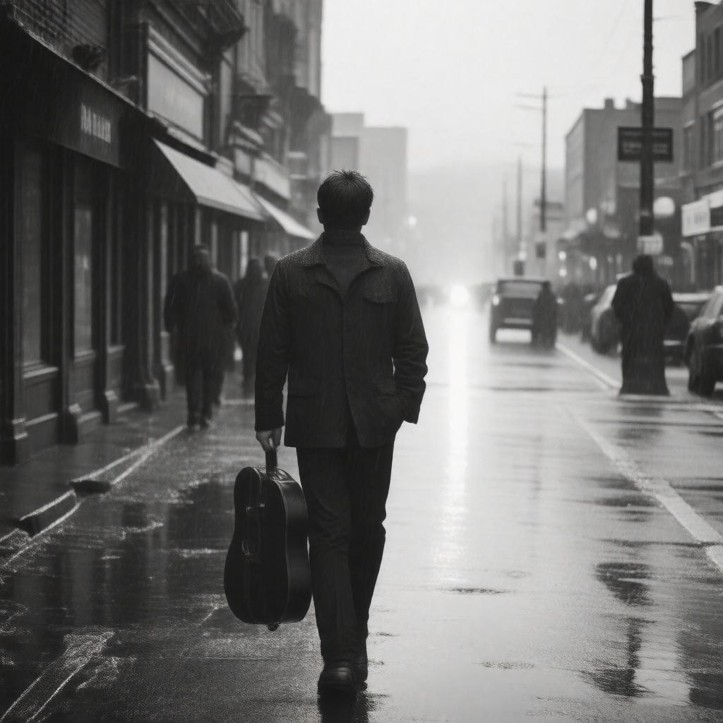 A moody, black-and-white cinematic still of a young folk musician, Llewyn Davis, walking down a rainy street in Greenwich Village, New York City, in 1961, with a guitar case in hand, evoking a sense of melancholy and struggle, inspired by the film "Inside Llewyn Davis", directed by Joel and Ethan Coen.