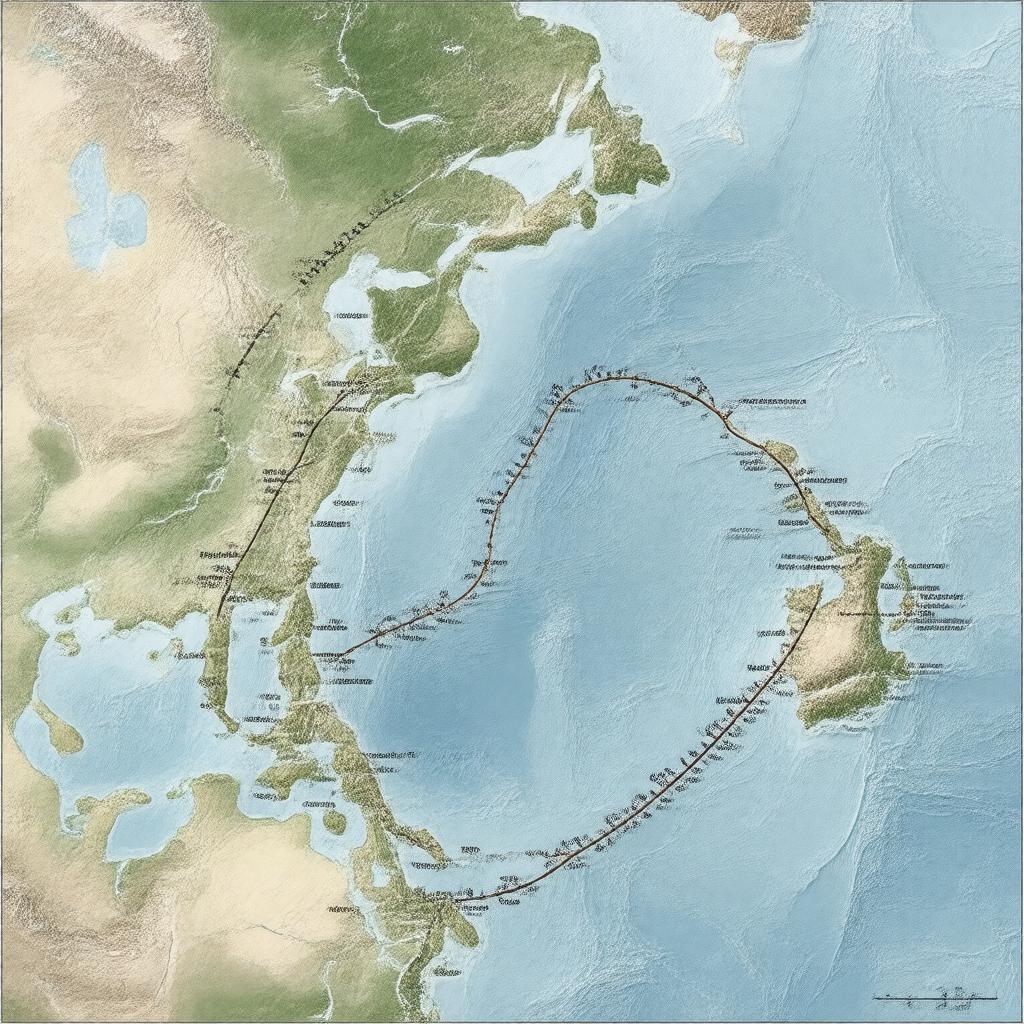 "Generate an image of a curved, zigzagging line in the Pacific Ocean, roughly following the 180th meridian, with annotations indicating its deviations around various territories and island groups, such as the Aleutian Islands, Fiji, Kiribati, and Samoa, with a subtle background map of the surrounding geography, representing the International Date Line, an imaginary line that marks the change of calendar day."