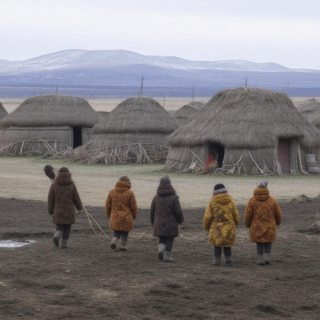 "Generate an image of a traditional Inupiat village in Alaska, with sod houses and igloos in the background, and people dressed in parkas and mukluks engaging in subsistence activities such as whaling, fishing, and caribou hunting, with a festive atmosphere hinting at a celebration like Nalukataq or Kivgiq."