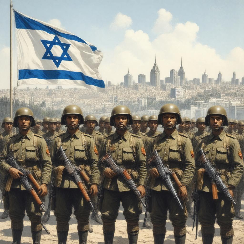 "Generate an image of a group of Irgun fighters in military uniform, standing in front of a Zionist flag, with a cityscape of Tel Aviv in the background, representing the Zionist paramilitary organization during its active years in Mandatory Palestine, 1931-1948."