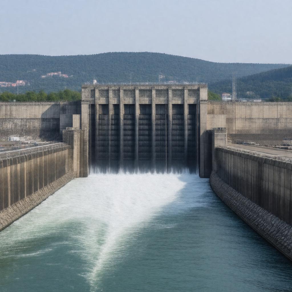 "Generate a realistic image of the Iron Gate hydroelectric power station, situated on the Danube River between Serbia and Romania, showcasing its massive structure and surroundings, with a focus on its role in power generation, navigation, and flood control, in a style reminiscent of industrial architecture photography."