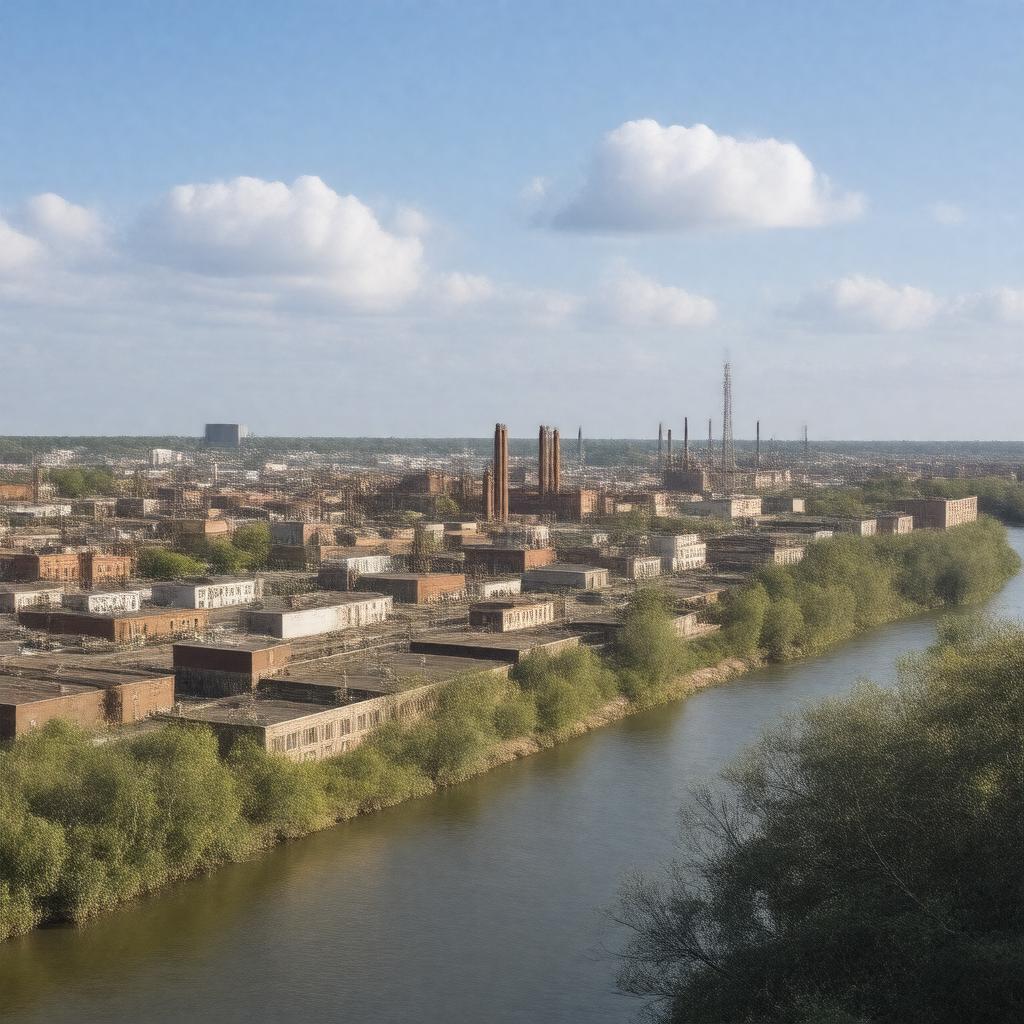"Generate a realistic image of a small city situated on the banks of the Ohio River, with a mix of industrial and residential buildings, and a cityscape that reflects its rich history and iron industry heritage, during a sunny day with a few clouds, in a style that captures the charm of a Midwestern American city, specifically depicting Ironton, Ohio."