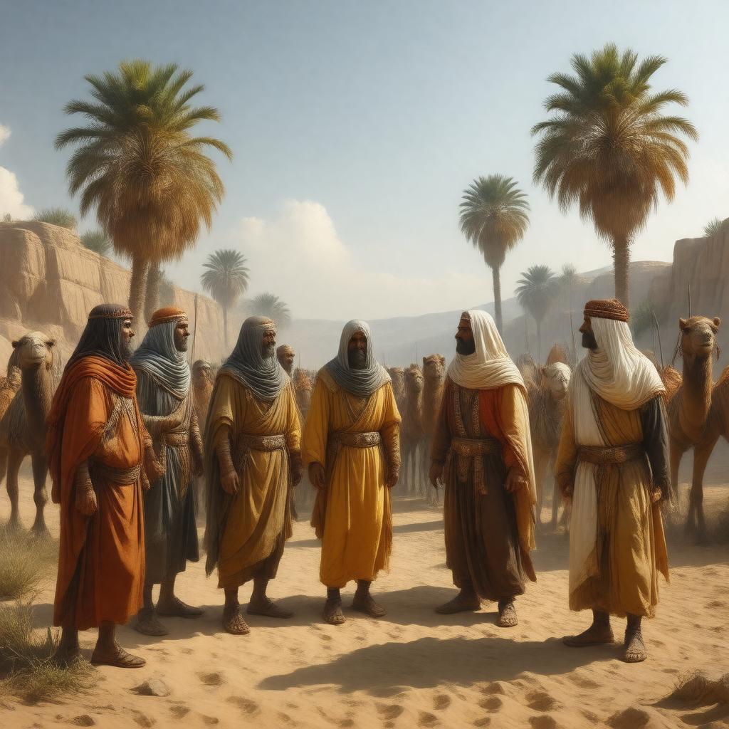 "Generate an image of a group of people in traditional Middle Eastern attire, situated in a desert landscape with palm trees and camels in the background, representing the Ishmaelites, an ancient ethnic group from the Arabian Peninsula, with a style that reflects the Bronze Age or Iron Age, incorporating elements of Ancient Semitic cultures."