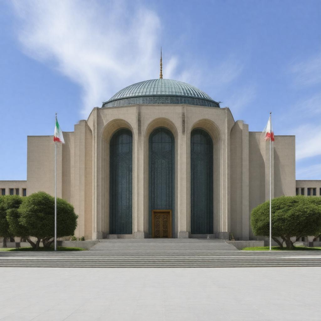 "Generate an image of the Islamic Consultative Assembly building, also known as Baharestan, located in Tehran, Iran. The image should depict the exterior of the building in a realistic style, with a focus on its architectural details. The building should be set against a backdrop of a clear blue sky with a few clouds. In the foreground, there should be a few Iranian flags flying in front of the building. The overall tone of the image should be formal and official, reflecting the importance of the Islamic Consultative Assembly as the national legislature of Iran."
