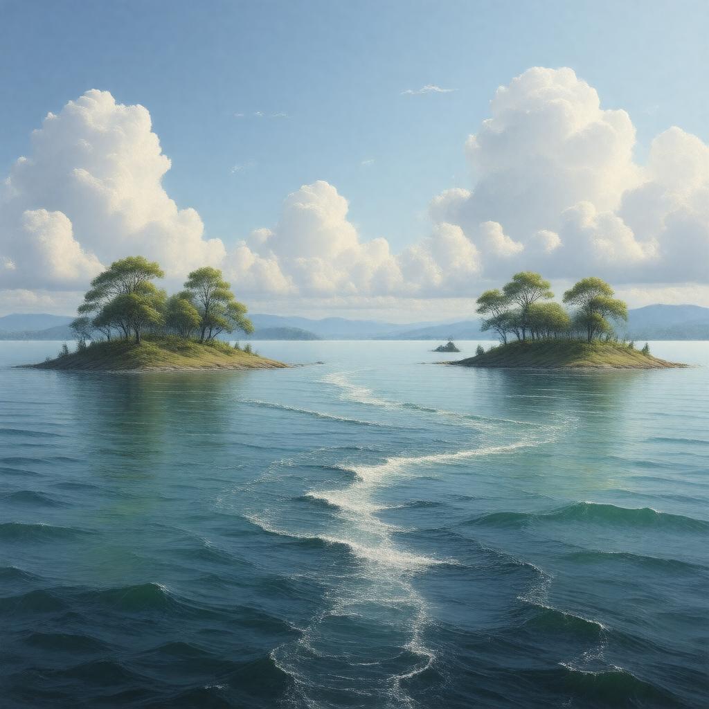 "Create an image of a serene and idyllic scene with a few islands in the middle of a calm sea, with a stream flowing gently through one of the islands, under a bright and sunny sky, representing the iconic country-pop song 'Islands in the Stream'."
