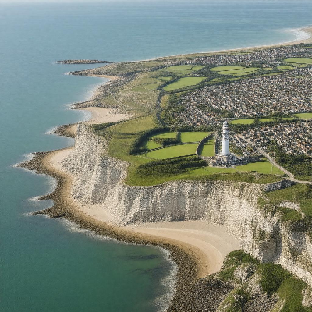 "Aerial view of the Isle of Portland, a small island located off the coast of Dorset, England, with the Portland Bill Lighthouse standing tall on the southern tip, surrounded by the Chesil Beach and the Jurassic Coast, with the town of Fortuneswell and other settlements visible, showcasing the island's unique limestone landscape and historic landmarks."