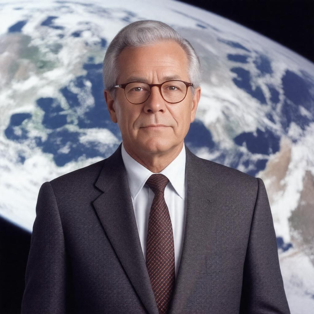 Generate a realistic image of a middle-aged to elderly American man in the 1980s or 1990s, wearing a suit and standing in front of a background that subtly suggests technology or navigation, such as a faint image of the Earth's surface or a simple model of a satellite. The man should have a distinguished and thoughtful expression, with grey or white hair, and glasses. He should be posed in a way that conveys authority and intelligence. The style should be formal and documentary, similar to a portrait that might be used in an academic or professional setting.