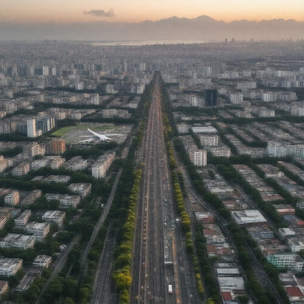 "Generate an image of a metropolitan landscape at dusk, showcasing a sprawling cityscape with numerous high-rise buildings, highways, and residential areas, representing Jabodetabek, the Greater Jakarta area, with a mix of modern and industrial architecture, surrounded by lush greenery, with a prominent airport, Soekarno-Hatta International Airport, and a bustling railway station, Gambir Station, in the vicinity, set against a backdrop of a vibrant Indonesian sunset, with a population density that reflects its status as one of the most populous urban agglomerations in the world."