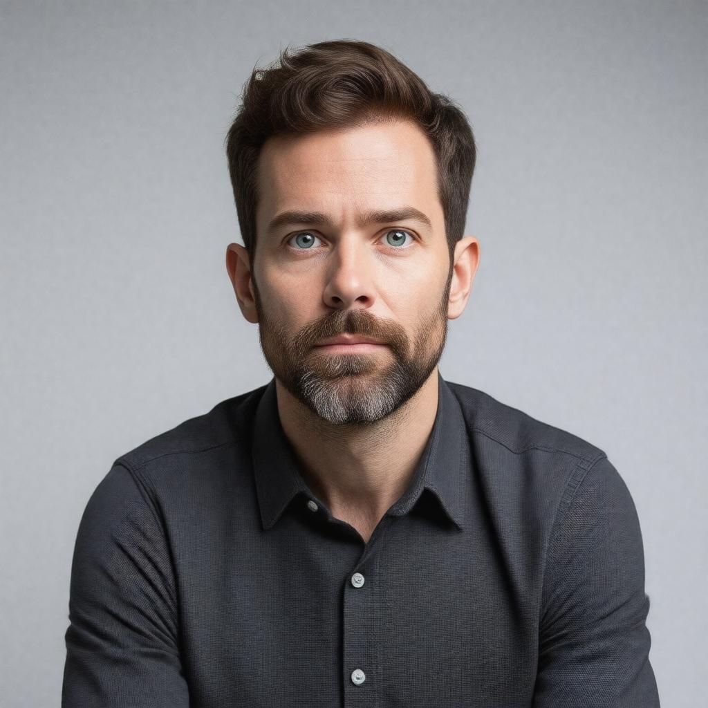 "Generate a realistic portrait of Jack Dorsey, a middle-aged American entrepreneur and software engineer, with brown hair and blue eyes, wearing a simple yet stylish outfit, sitting in a minimalist background with a subtle hint of technology-inspired elements, reflecting his role as a former CEO of Twitter and co-founder of Block, Inc. and Square, Inc."