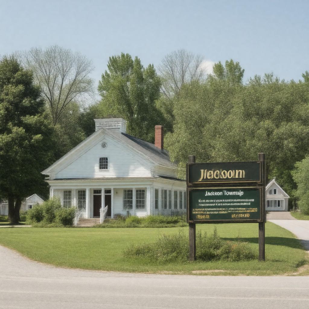 "Generate a realistic image of a small town in a rural setting, with a town hall or welcome sign in the foreground, surrounded by trees and buildings, representing Jackson Township, a common town name in the United States, particularly in Ohio, Indiana, Pennsylvania, Iowa, Missouri, and New Jersey, named after Andrew Jackson, with a classic American architectural style."